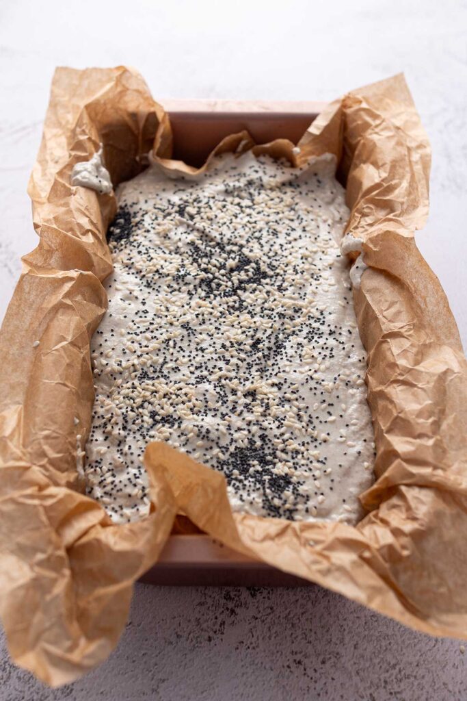 - Pour the fermented buckwheat dough into the prepared loaf pan. If using, sprinkle the top with poppy and sesame seeds.