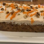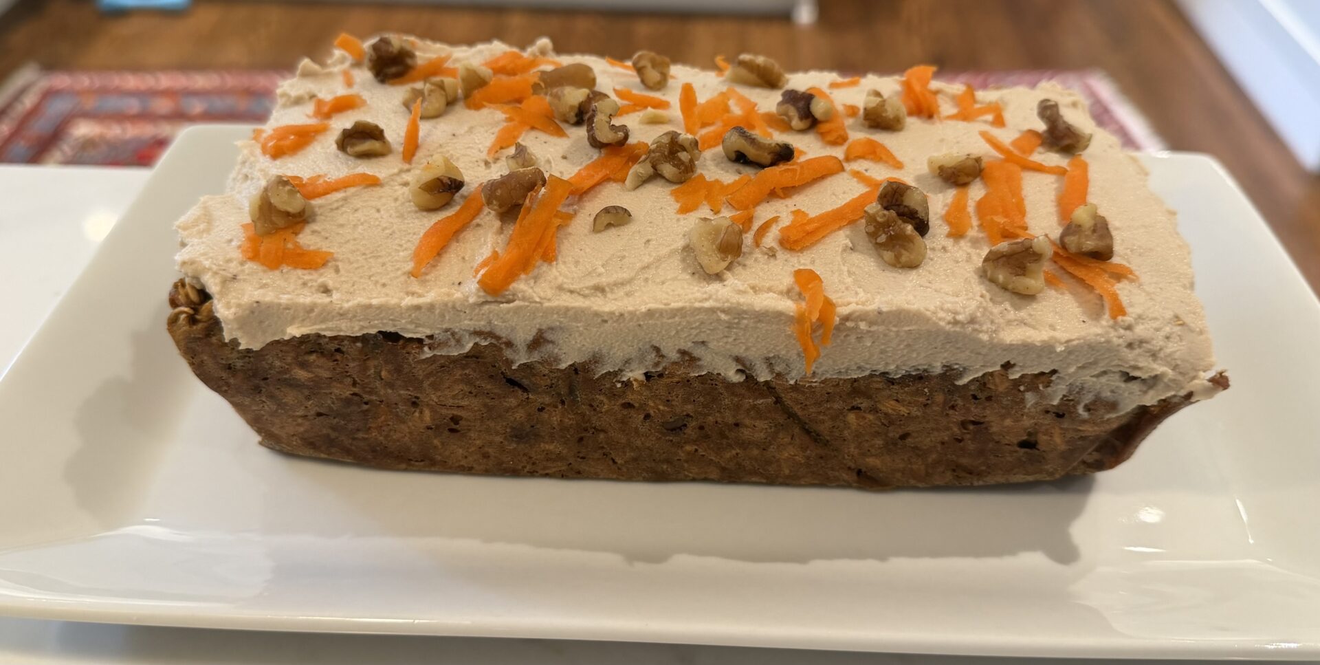 - Allow the baked oats to cool slightly before slicing. The longer it cools, the firmer it gets and the easier it is to slice. Top with the protein icing, and optionally some extra shredded carrots and walnuts.