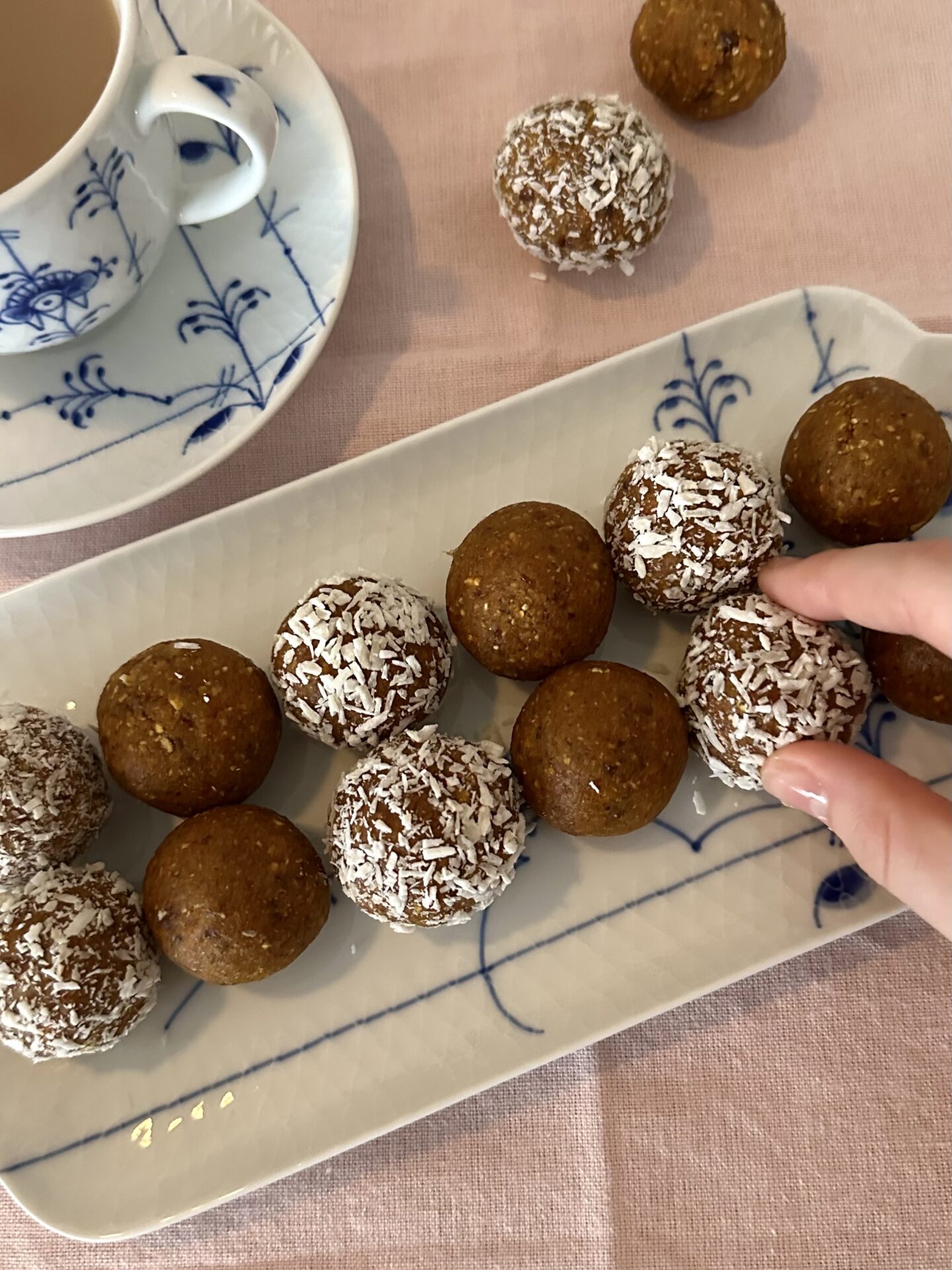 A plate full of Carrot Cake Bliss Balls rolled in shredded coconut.