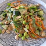 - Assemble the salad: In a large serving bowl, combine the edamame, carrot, cucumber, mint, cilantro, scallions, crispy potatoes, chopped peanuts, and peanut sauce. Toss gently and serve immediately for the best texture.