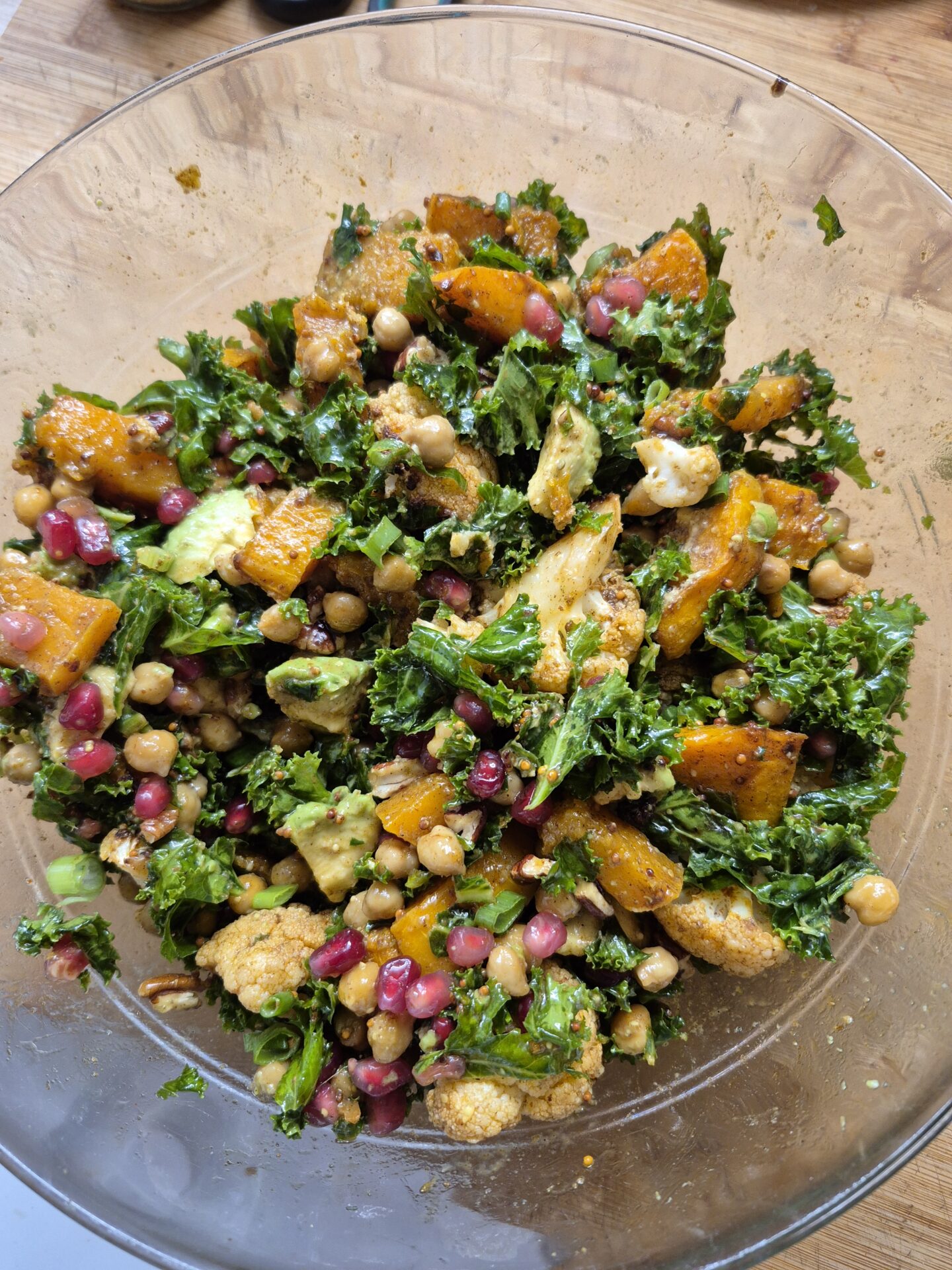 - Assemble: In a large serving bowl, add the mixed leaf salad, roasted vegetables, chickpeas, avocado, pomegranate, mint, and candied pecans, and drizzle with the dressing. Mix well and serve right away for the best texture.