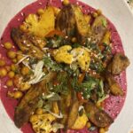 Start by preheating the oven to 400°F/200°C fan forced for perfect vegetable roasting. Combine the array of spices to create a flavorful coating. Spread the diced potatoes with olive oil and half of the spice blend on a lined baking tray. Prepare the beetroot and bake until tender. Mix the chickpeas and cauliflower with the remaining spices and oil, then roast until golden. Blend the beetroot with silken tofu and additional ingredients for a smooth, inviting sauce. Serve the vegetables over the sauce and garnish with fresh dill and seeds for a beautiful presentation.