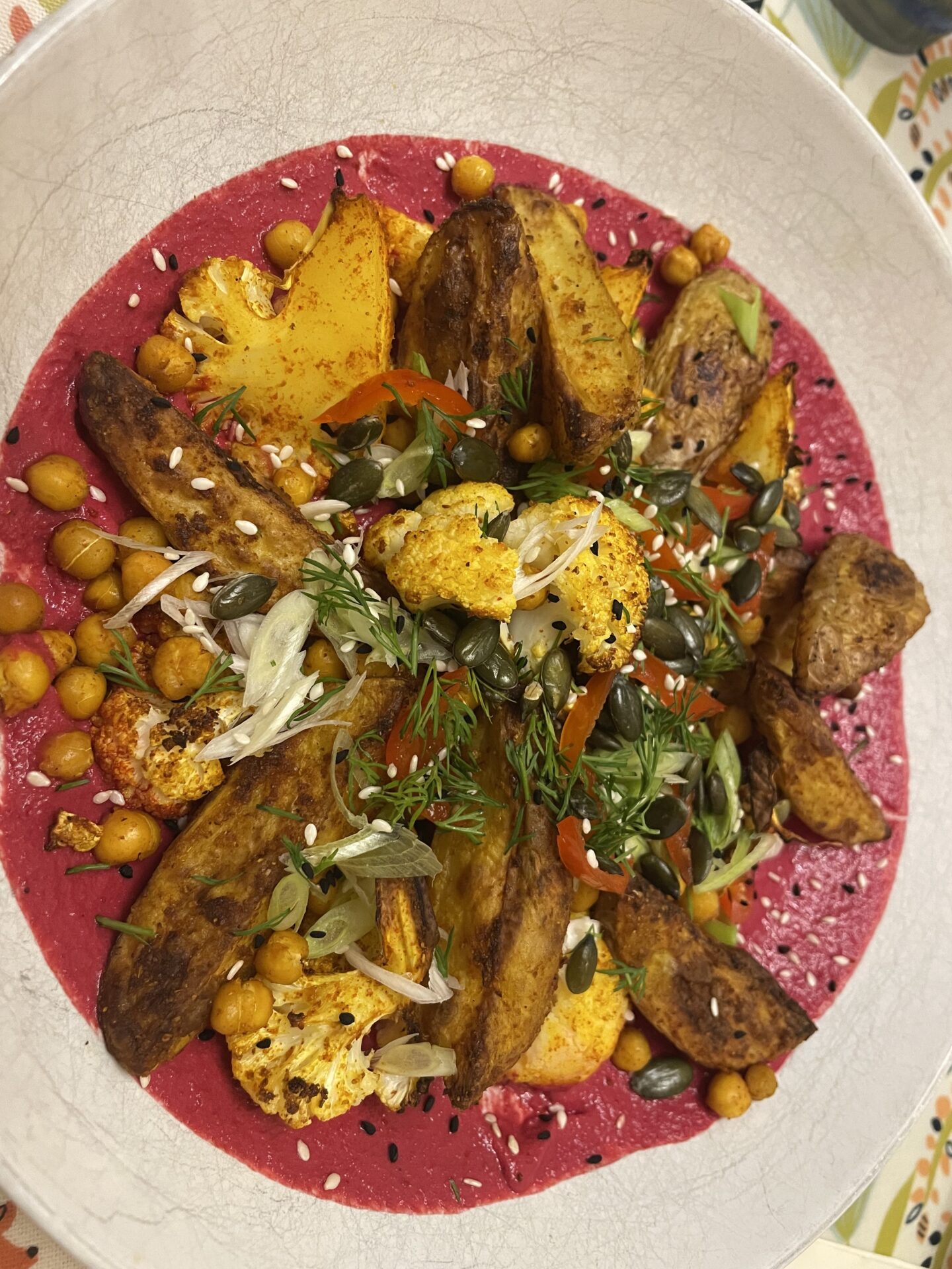 - Assemble and Serve: Spoon the sauce into serving bowls. Top with the roasted potatoes, chickpeas, and cauliflower. Garnish with chopped spring onions, fresh dill, pepitas, black sesame seeds, and a dash of freshly cracked black pepper. Enjoy!
