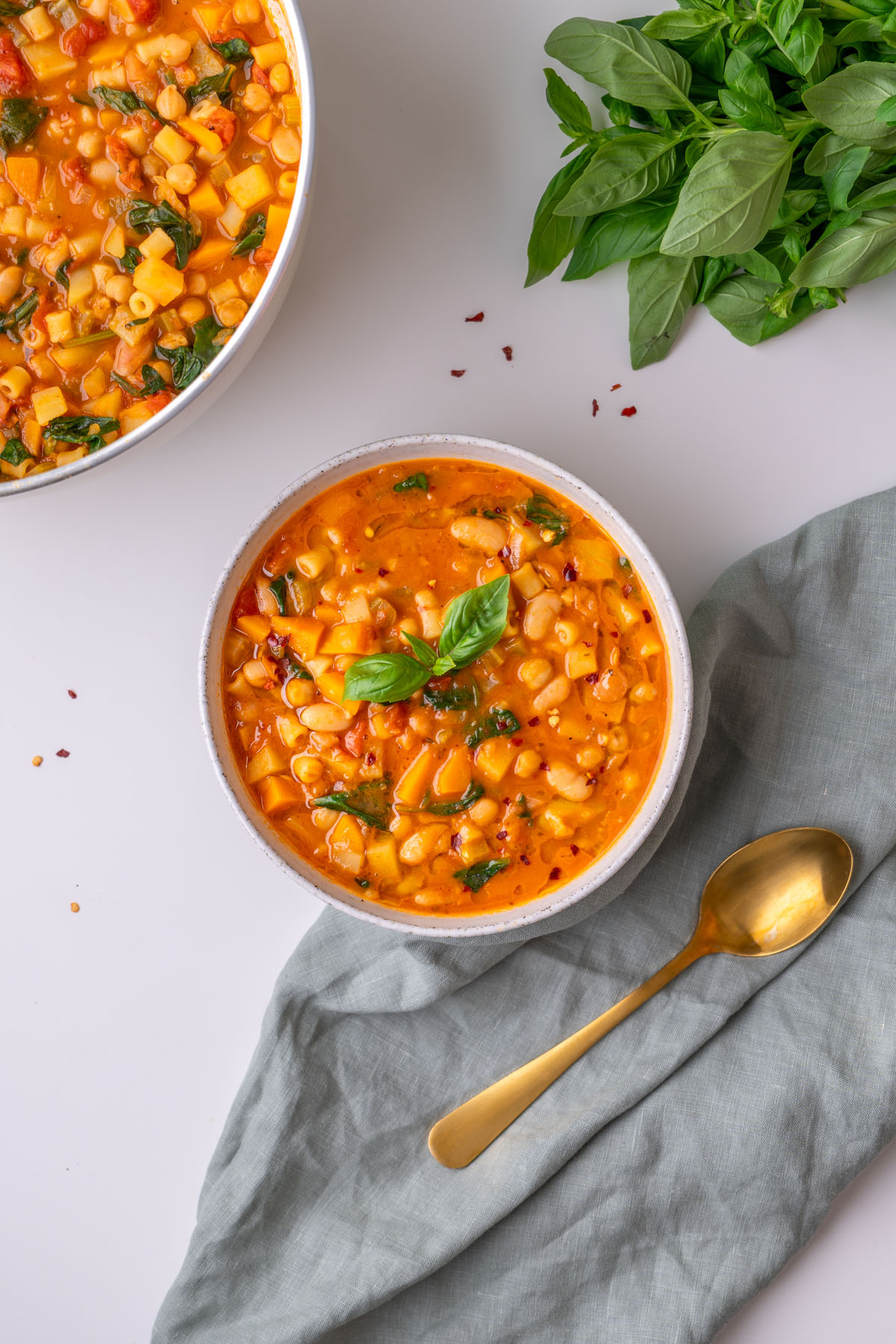 This longevity minestrone is inspired by that same lens. A humble bowl that feels like a hug and fits beautifully into a balanced routine. Loaded with cannellini beans, chickpeas, baby spinach, and whole-wheat pasta, it’s packed with plant protein, iron, and fiber, and is great for gut health. It comes together easily in one pot, fills your home with the most amazing aroma, and tastes even better the next day. If you love simple, nourishing soups that make you feel your best, this one is absolutely for you.
