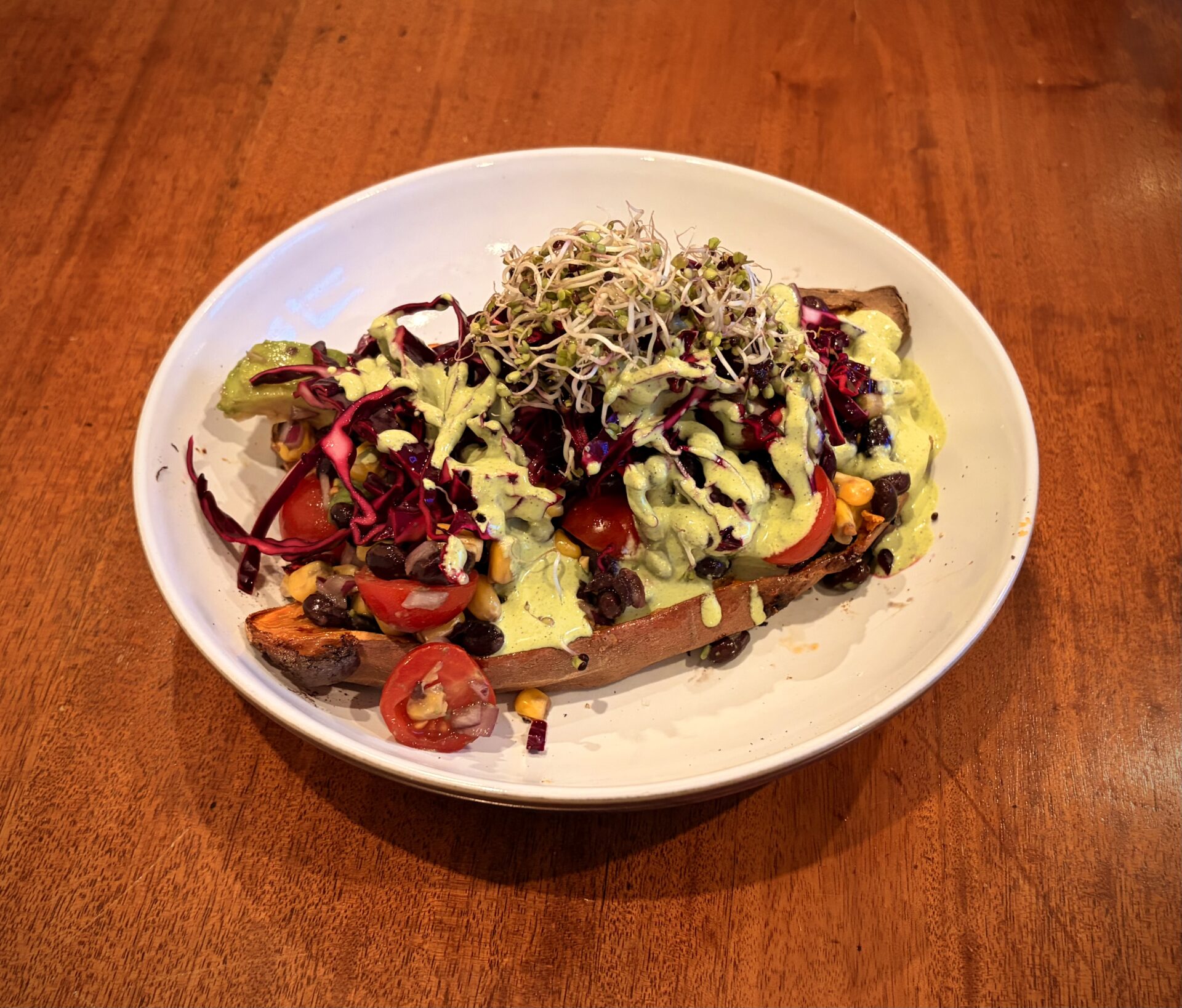 - Top the sweet potatoes with the black bean mixture, massaged cabbage, and broccoli sprouts. Drizzle generously with the Yogurt Cilantro Sauce and enjoy!