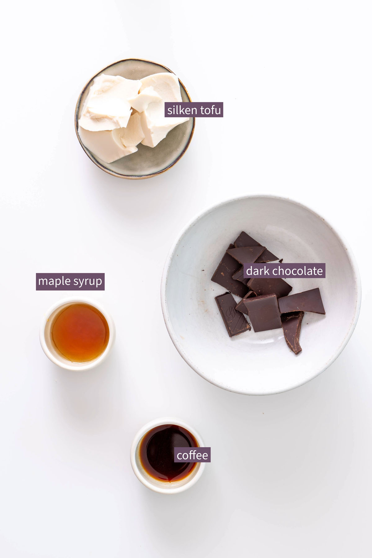 Melt the dark chocolate gently, then blend it with silken tofu, coffee, and maple syrup until completely smooth.