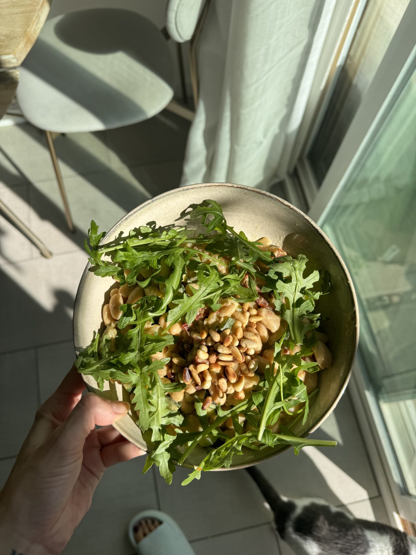 Bowl of creamy lemon zucchini beans topped with arugula and pine nuts
