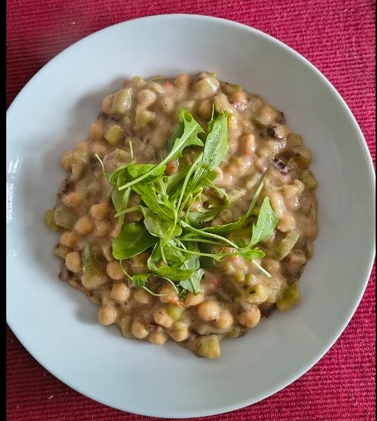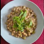Top view of creamy zucchini and beans with fresh arugula garnish