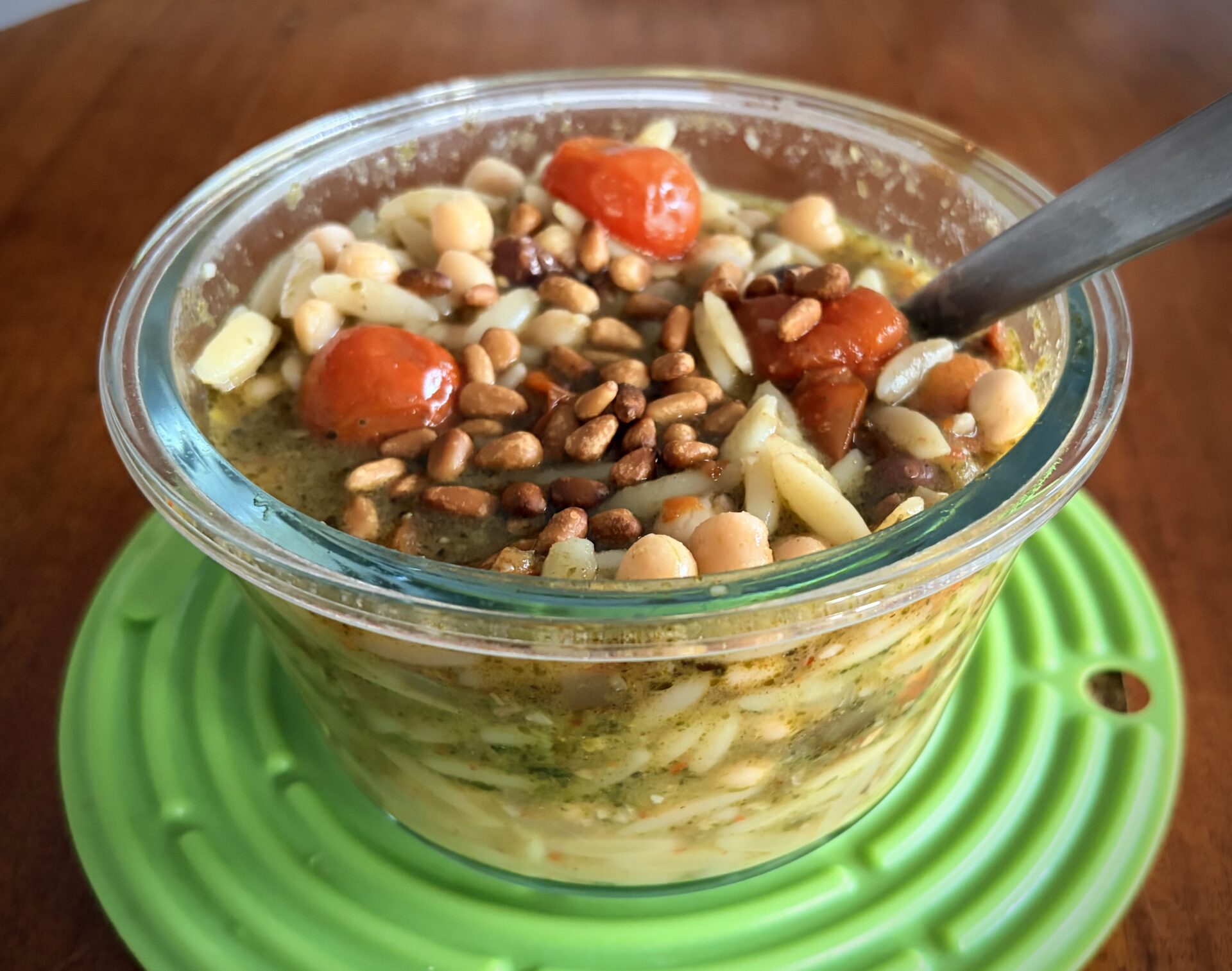 Bake the bowls for 25 minutes or until the orzo is tender. While the bowls bake, toast the pine nuts in the oven until golden, about 8-10 minutes.