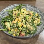 Assemble the salad by combining quinoa, corn, asparagus, avocado, cucumber, arugula, butterbeans, grapefruit, pine nuts, and mint. Drizzle with dressing, toss gently, and season to taste. View recipe card below for detailed instructions.
