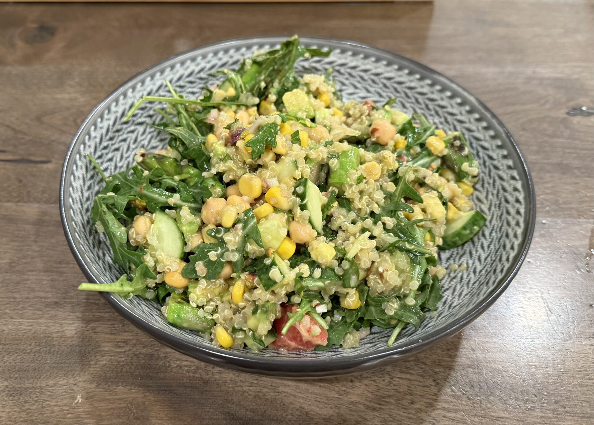 - Assemble the salad: In a large bowl, combine the arugula, quinoa, corn, asparagus, avocado, cucumber, butterbeans, toasted pine nuts, grapefruit, and mint. Pour over the vinaigrette and toss gently to combine. Season with salt and pepper to taste. Enjoy!