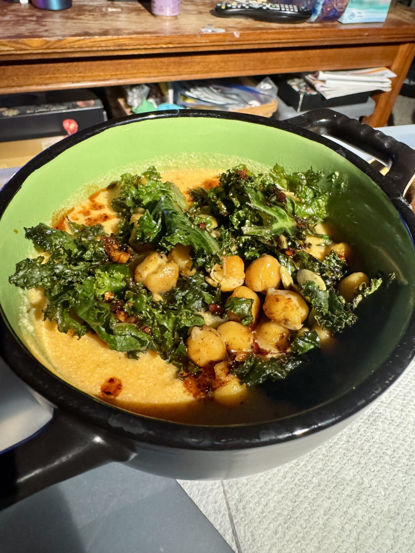 Prepare toppings: Toss chickpeas and kale with olive oil and zaatar on a baking sheet. Roast until crispy.