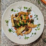- Assemble: Spread the sauce on the base of a plate, top with the roasted veggies, then garnish with scallion and toasted almonds, enjoy!