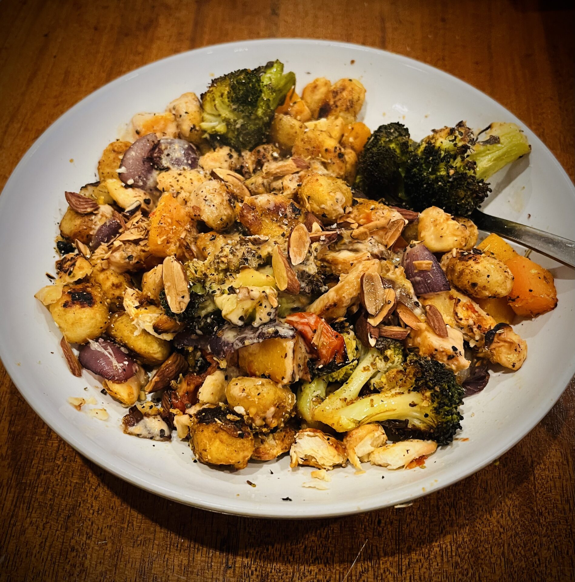 - Assemble: Spread the sauce on your plate, then top with the baked vegetables, gnocchi, toasted almonds, and arugula (if using). Enjoy!
