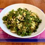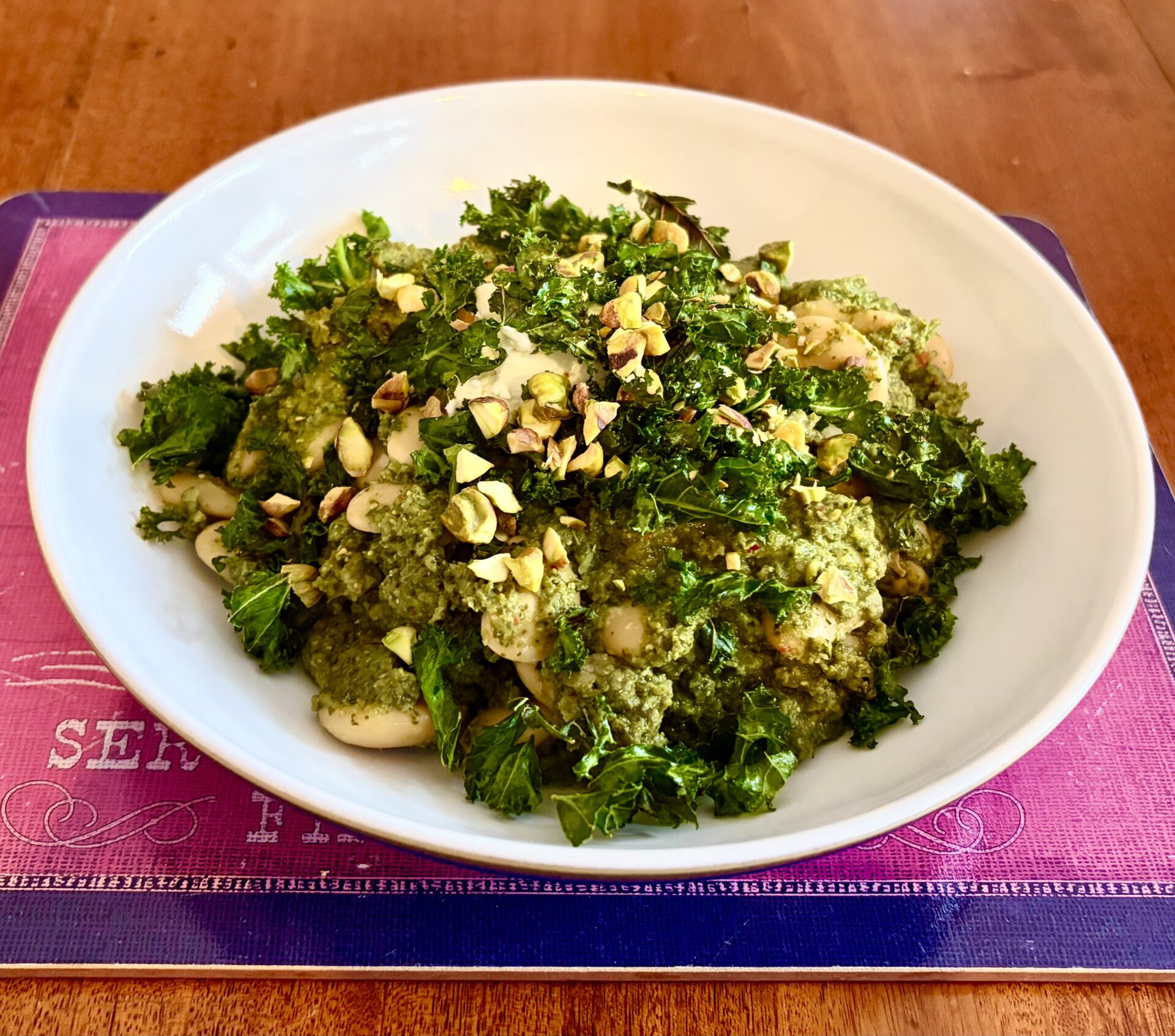Final plated dish of Super Green Butter Beans with pistachios and crispy kale garnish