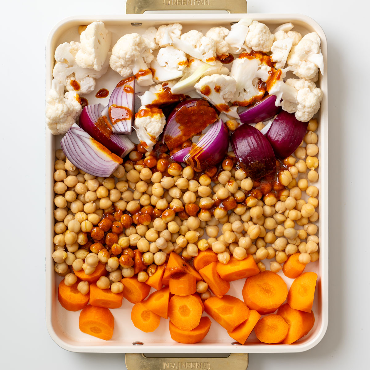 Pat the chickpeas dry with a clean kitchen towel for maximum crispiness, then add them to the pan along with the red onion, cauliflower, and carrots. Then pour the marinade over the veggies and toss well.