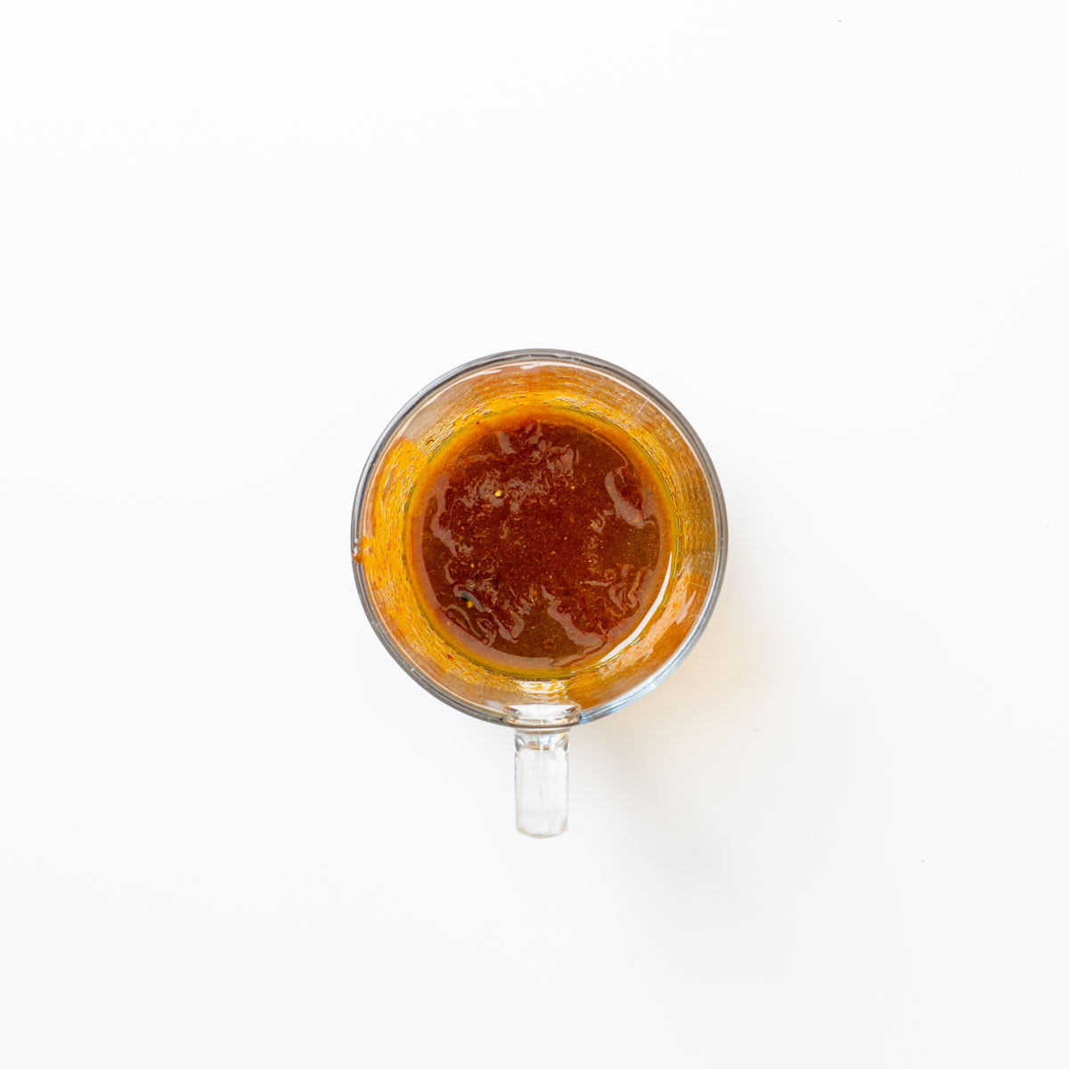 Mix the maple syrup, harissa, olive oil, cumin, turmeric, salt, and pepper in a jar or bowl.