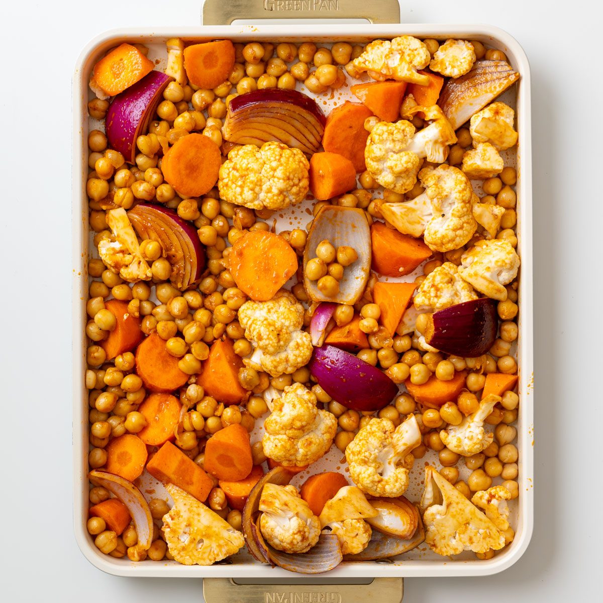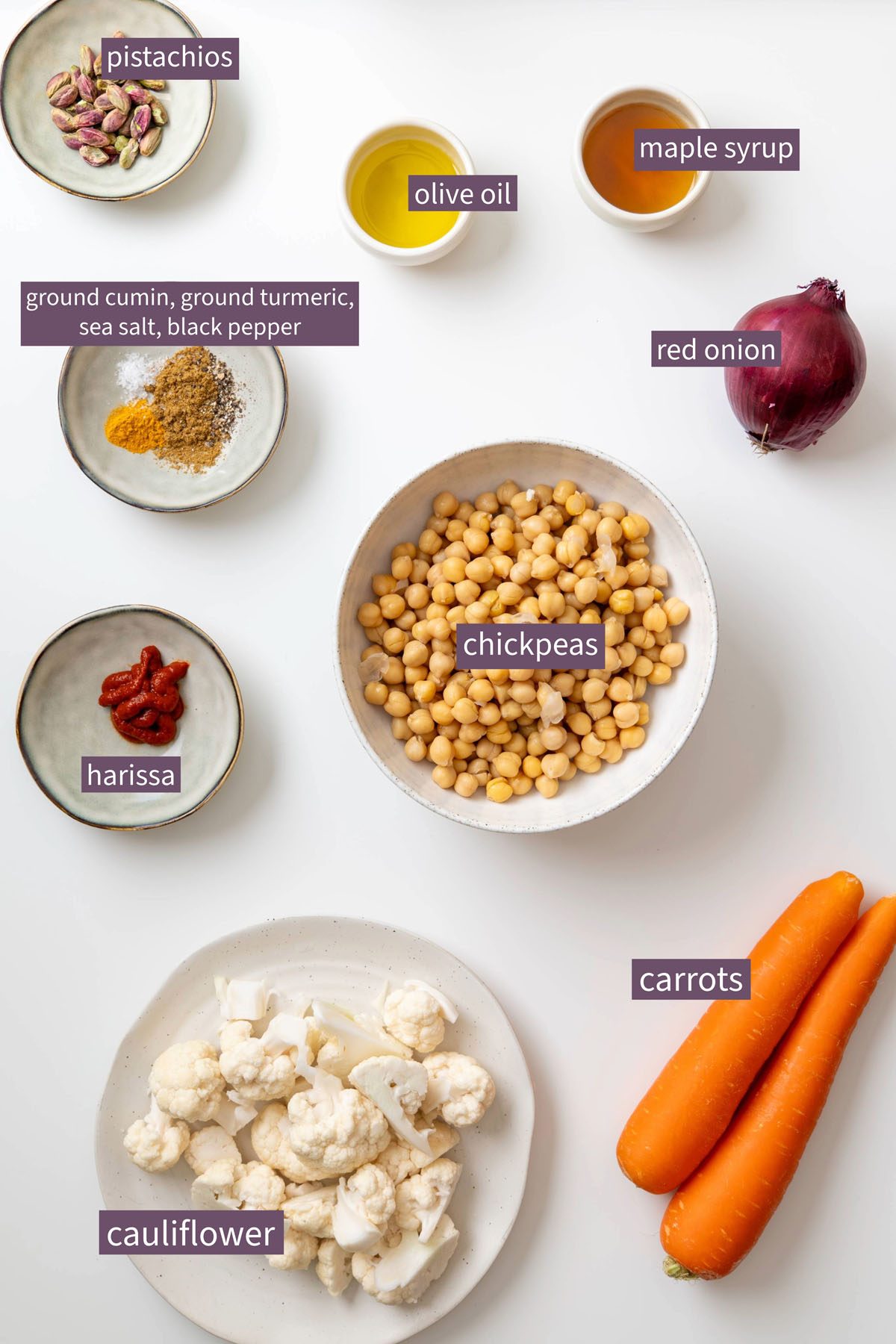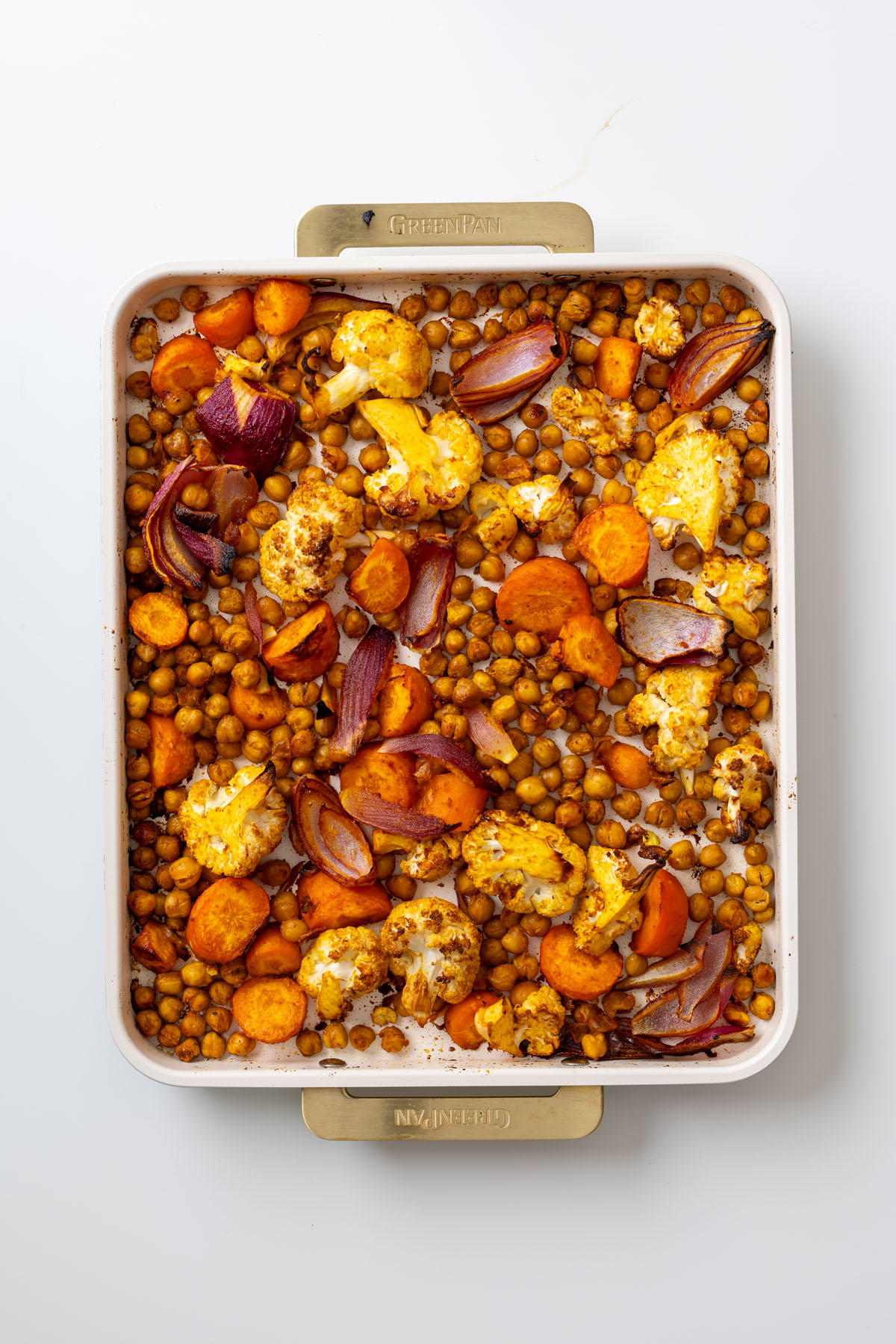 - Roast the chickpeas and veggies: Pat dry the chickpeas in a clean kitchen towel, for the crispiest result. Add the chickpeas, red onion, cauliflower, and carrots to the pan. In a small bowl, mix the maple syrup, harissa, olive oil, cumin, turmeric, a pinch of salt, and black pepper. Pour on the veggies. Toss well, spread out evenly, then roast for about 35 minutes, tossing once halfway, until the chickpeas are slightly crisp and the veggies are caramelized.