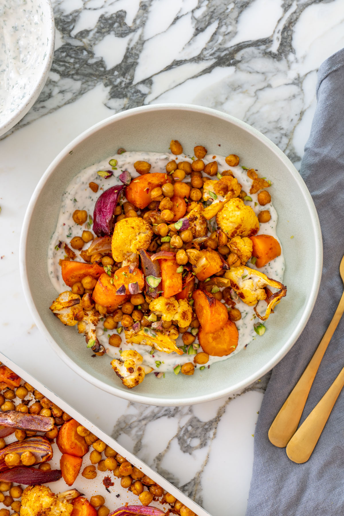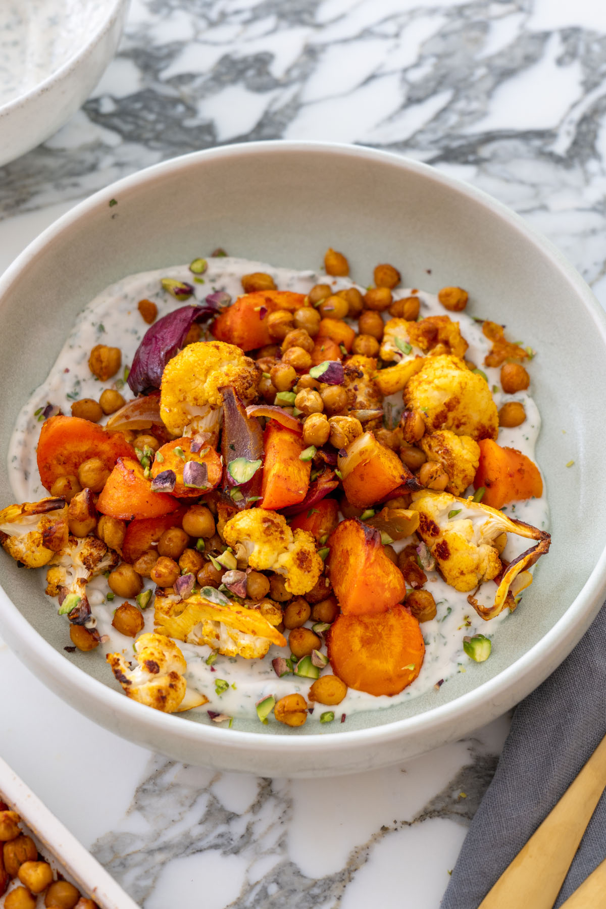 - Assemble and serve: Spoon the mint yogurt sauce into bowls. Top with the roasted chickpeas and veggies, then finish with pistachios. Enjoy!