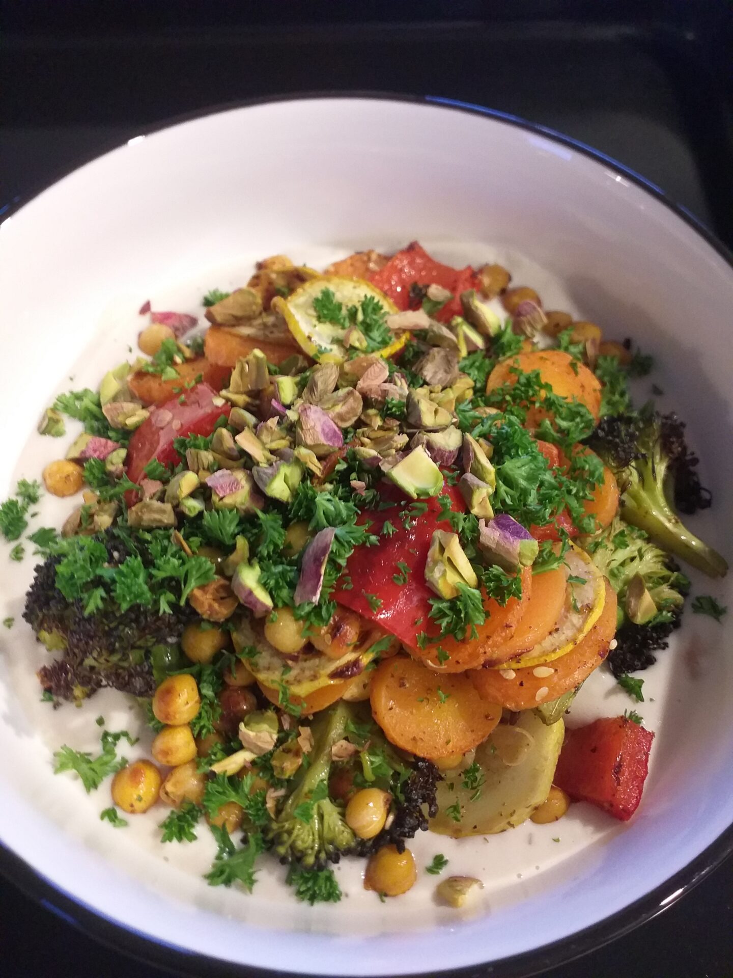 - To serve: spread the garlic confit dip in a bowl, layer with the roasted veggies and top with a sprinkle of pistachios and parsley, enjoy!