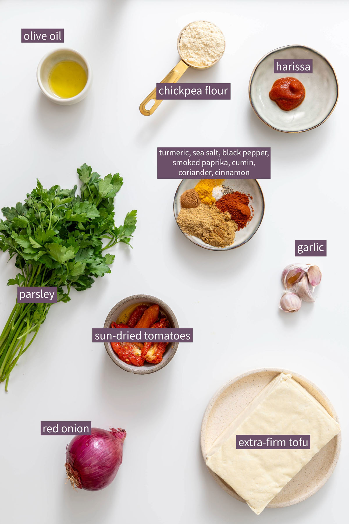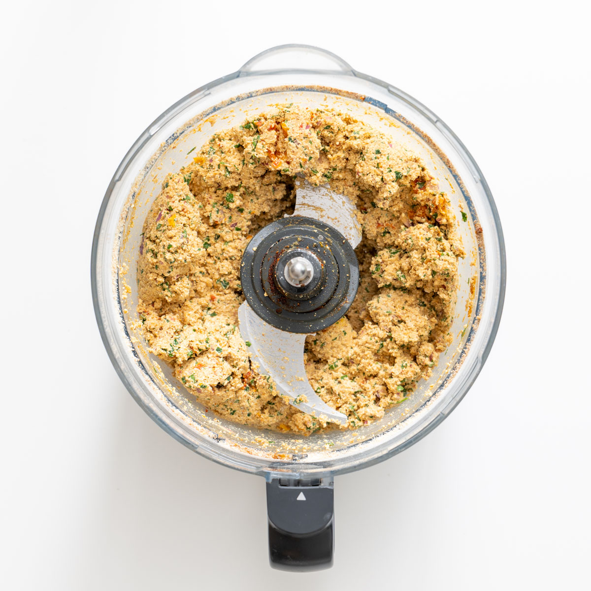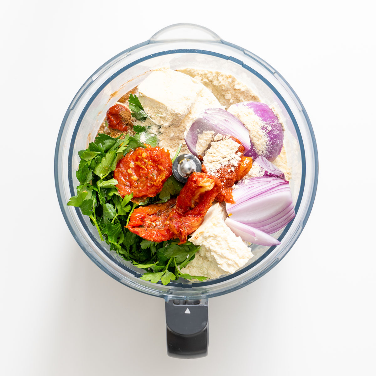 - Process: Add the tofu, sun-dried tomatoes, red onion, harissa or tomato paste, garlic, chickpea flour, parsley, and spices (turmeric, salt, pepper, smoked paprika, cumin, coriander, and cinnamon) to a food processor. Process until just combined.