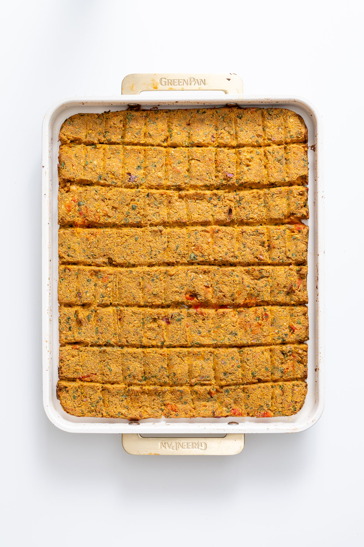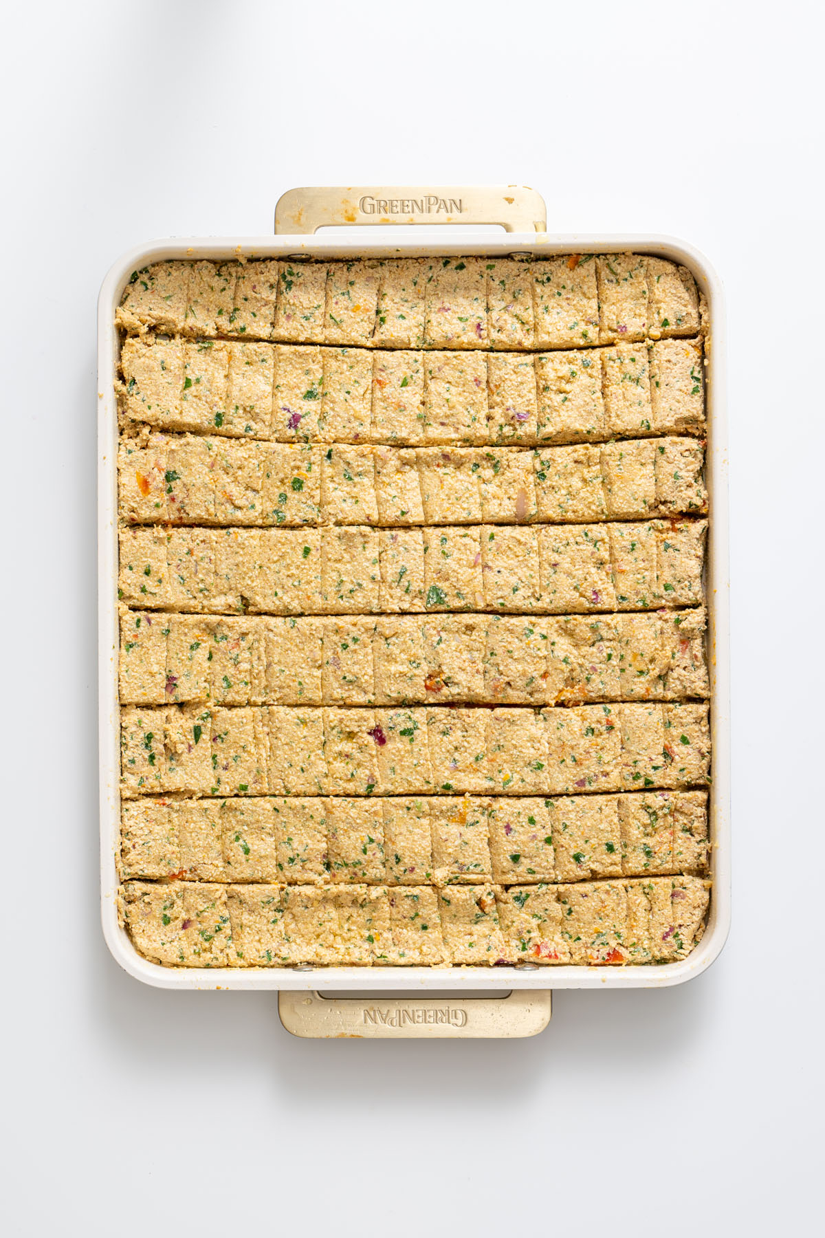- Shape and bake: Spread the tofu mixture onto the sheet pan. Use a spatula to smooth it into an even layer, then score it vertically into 8 pieces, cutting all the way through the tofu mixture (I like to use a silicone spatula). For that classic kebab look, you can add some shallow horizontal lines across the top of each piece (refer to photos for visual; keep it very shallow or it will separate once cooked). Brush or spray the top with olive oil, then bake on the top rack for 25 minutes.