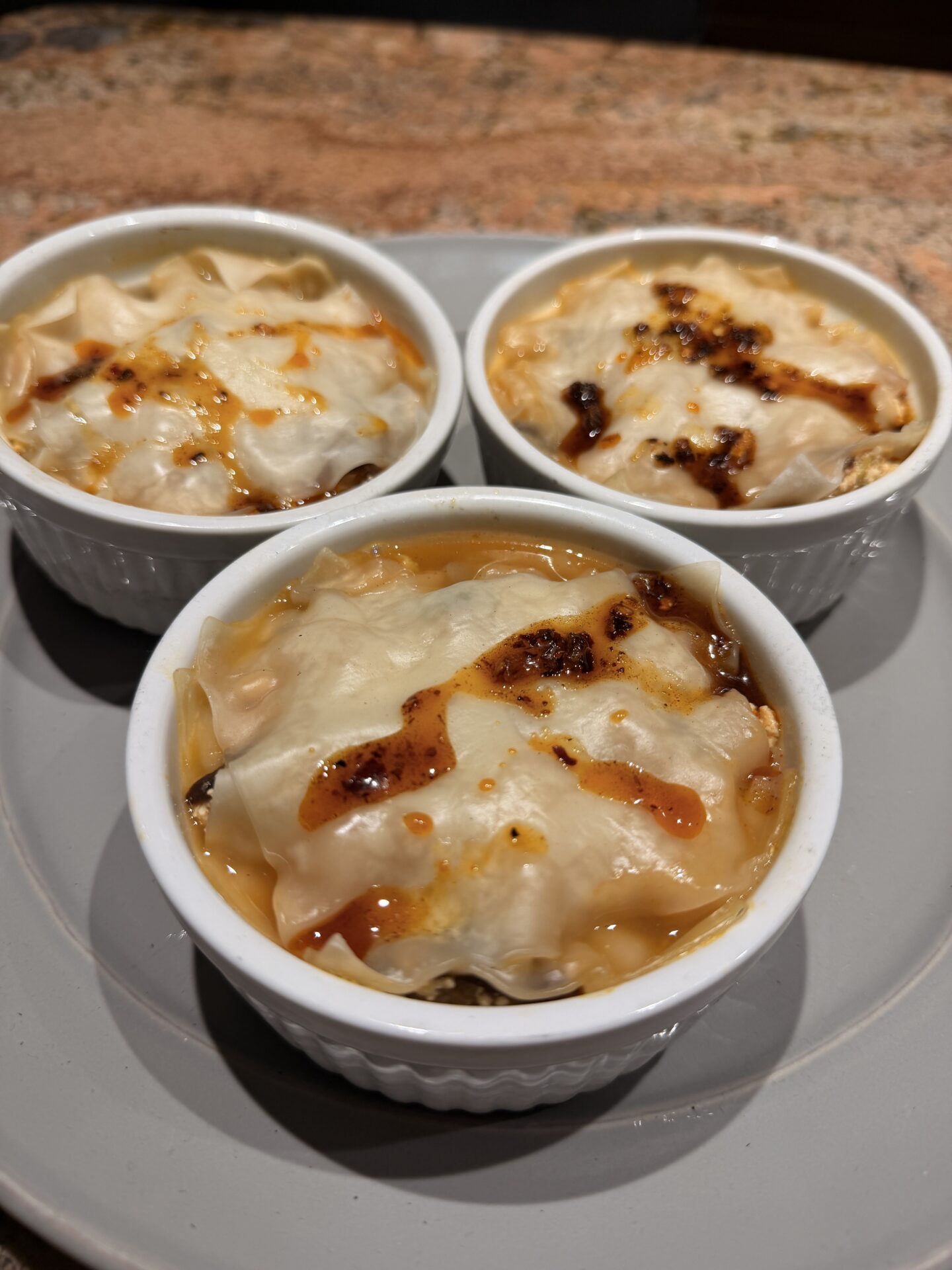 - Assemble: Prepare three small heat-safe bowls or mugs (about 1.5 cups volume each). Add 1 wonton wrapper to the bottom, spread a thin layer of filling, then repeat layers of wrapper and filling until near the top of your dish, to total 3 layers of wonton wrapper + filling. Pour some mushroom broth over the final filling layer to almost cover it, then seal it off with 2 wonton wrappers.