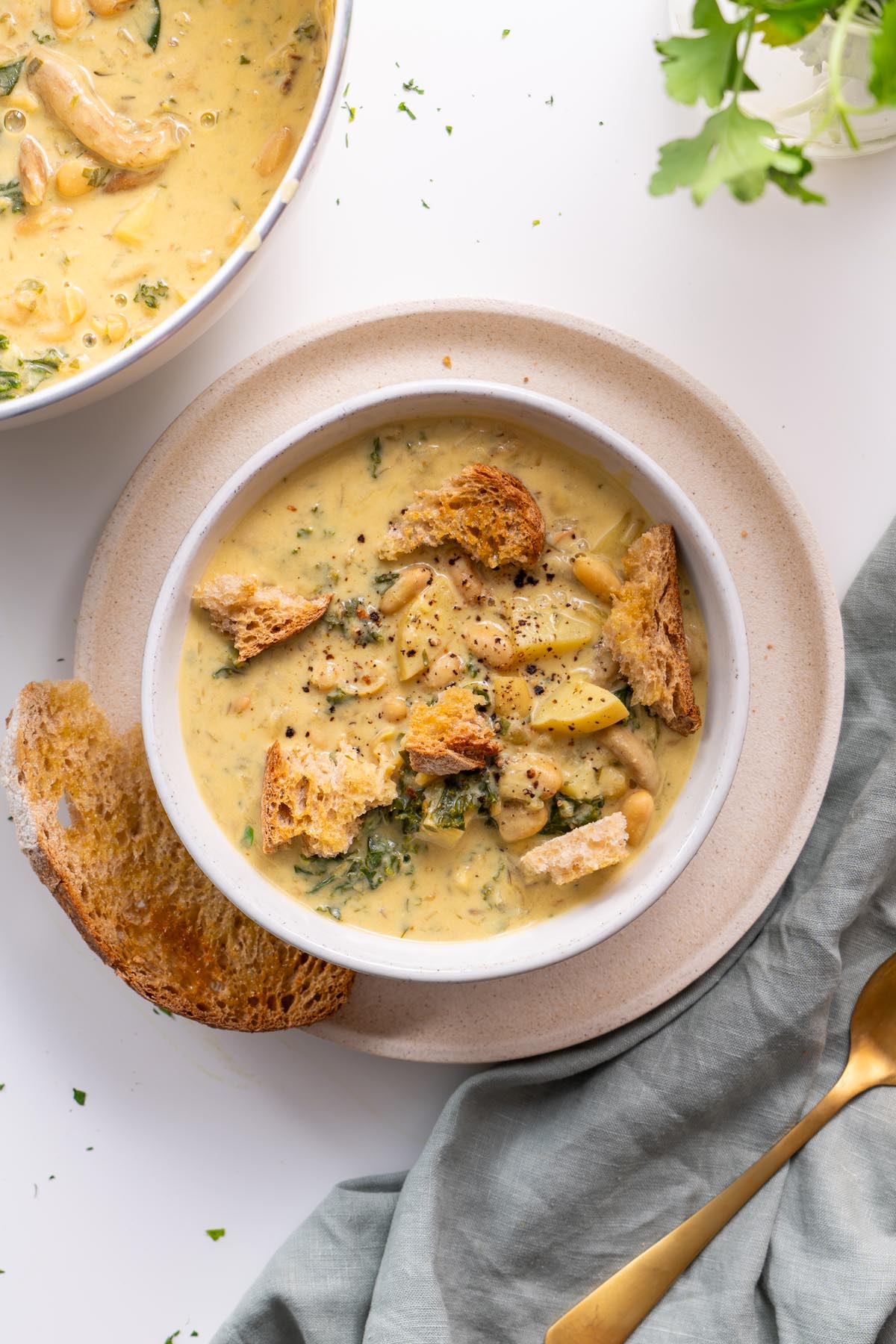 - Stir in the cream into the pot along with the kale and parsley. Cook for a further 5 minutes. Turn off the heat, stir in the lemon juice, and taste, adjusting the salt and pepper as needed. Serve with a slice of toasted sourdough or our gluten-free bread. Enjoy!